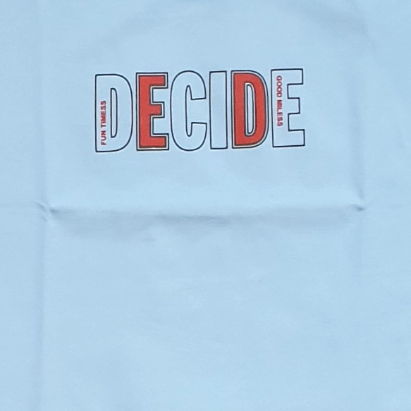 Centered on the chest of the top is a prominent graphic featuring the word “DECIDE.” The letters are stylized with black outlines.